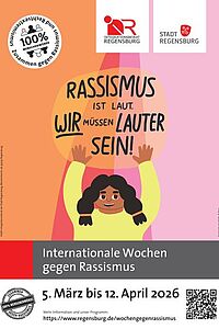 Die Internationalen Wochen gegen Rassismus 2026 in Regensburg finden vom 5. März bis 12. April statt. Unter dem Motto „100% Menschenwürde. Zusammen gegen Rassismus und Rechtsextremismus“ organisiert der Integrationsbeirat der Stadt Regensburg gemeinsam mit zahlreichen Kooperationspartnern wieder eine Fülle von Veranstaltungen und Aktionen.